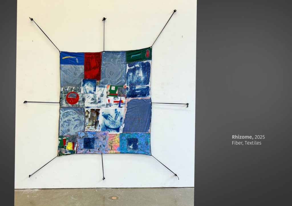 Rhizome (2025) operationalizes Carl Jung’s metaphorical proposition that “life has always seemed to me like a plant that lives on its rhizome. It’s true life is invisible, hidden in the rhizome… What we see is the blossom, which passes. The rhizome remains.” The work explores textiles as dense contexts and interwoven narratives stitched together to form a singular body. Each constituent fabric functions as a unique “blossom”—a tangible aesthetic manifestation replete with its own microhistory, a narrative encoded in its materiality and technique. Through varying dyeing, stitching, and image transfer techniques, Rhizome articulates the migratory patterns of artisanal knowledge across cultural and temporal boundaries. Thus, while each textile retains its autonomous narrative, it is subsumed within the larger work, revealing latent, subterranean connections and a conceptual rhizome. This rhizomatic web uncovers invisible histories of labor and transcultural exchange, situating meaning within the interstitial spaces that these stitched connections both create and occupy.