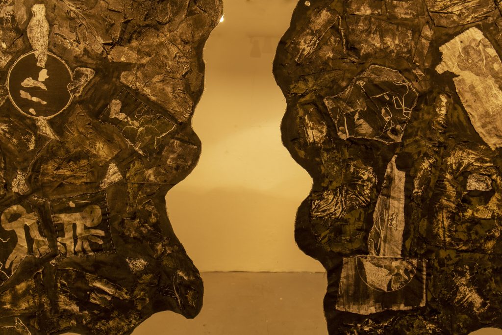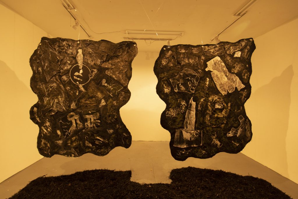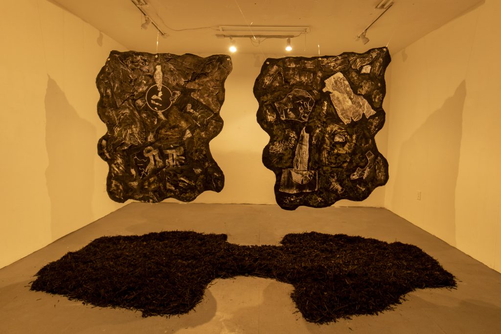 Yeepa! (2025) is a textile installation with monoprinted fabrics hand-stitched onto a textured, dark surface. This slow, deliberate process of stitching becomes a literal and metaphorical act of recording—one that leaves a trace of the body, of time, and of labor in the material. The textile is suspended above an earthy bed of black wood mulch, an anchor that localizes the work’s abstract flight and tethers it to the reality of a specific place. In this work, the use of a double serves as a kind of refraction—a bending and splitting of a point of origin to reveal a visual spectrum. It suggests that to move through the world is to exist in multiple, simultaneous states of being.